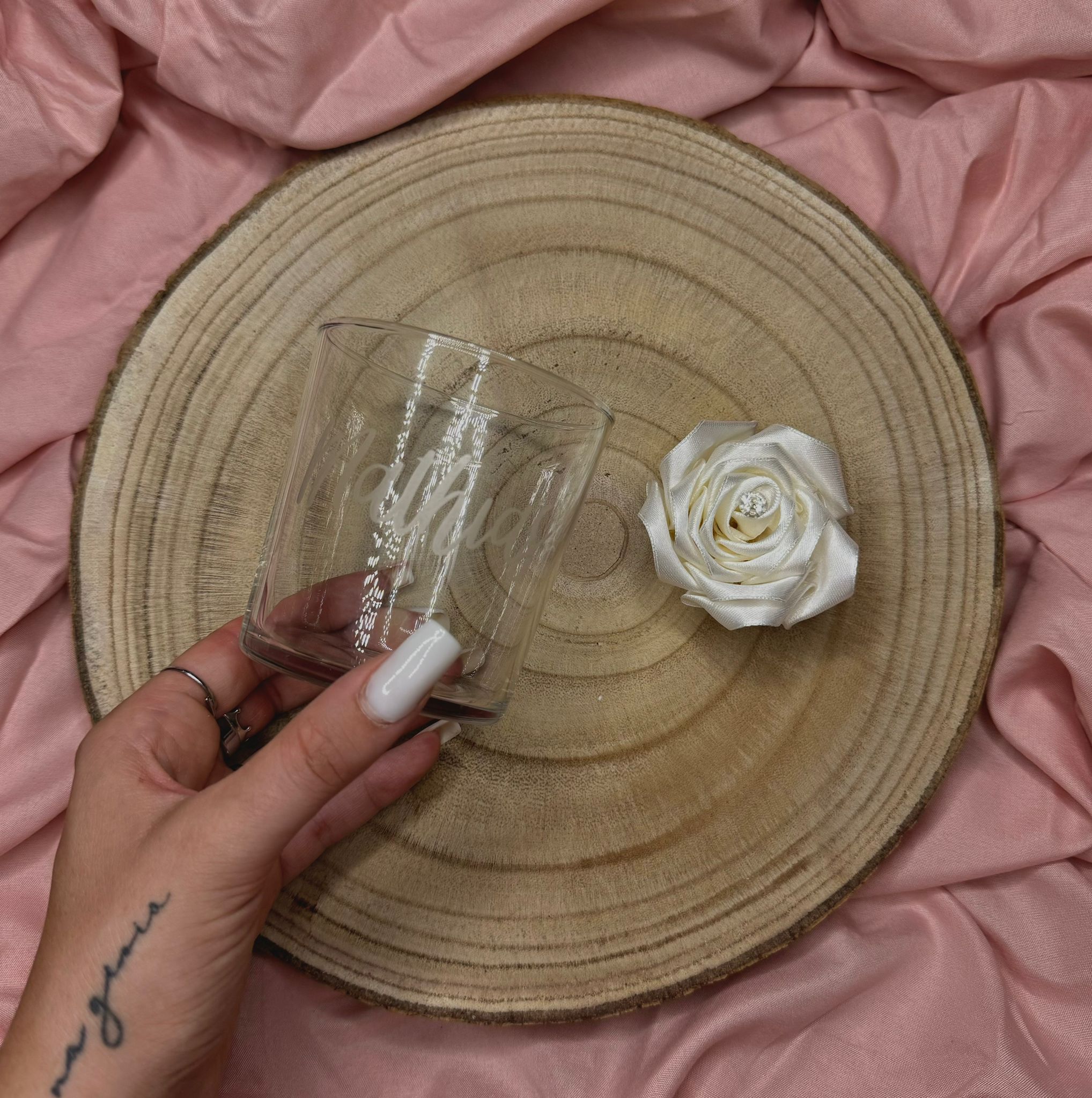 Bicchiere d’acqua in vetro, personalizzabile con un nome. Ideale per aggiungere un tocco personale alla tua tavola. Adatto alla lavastoviglie, garantendo praticità oltre che stile.