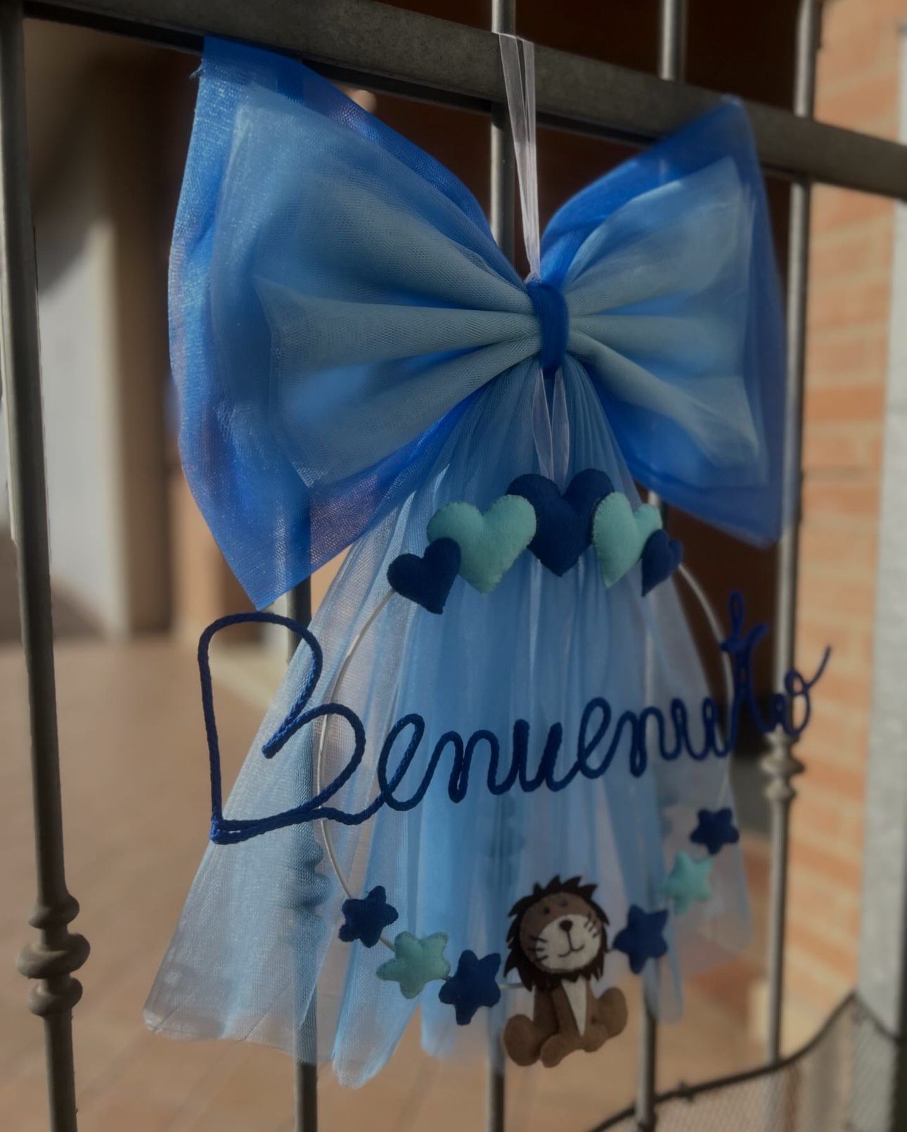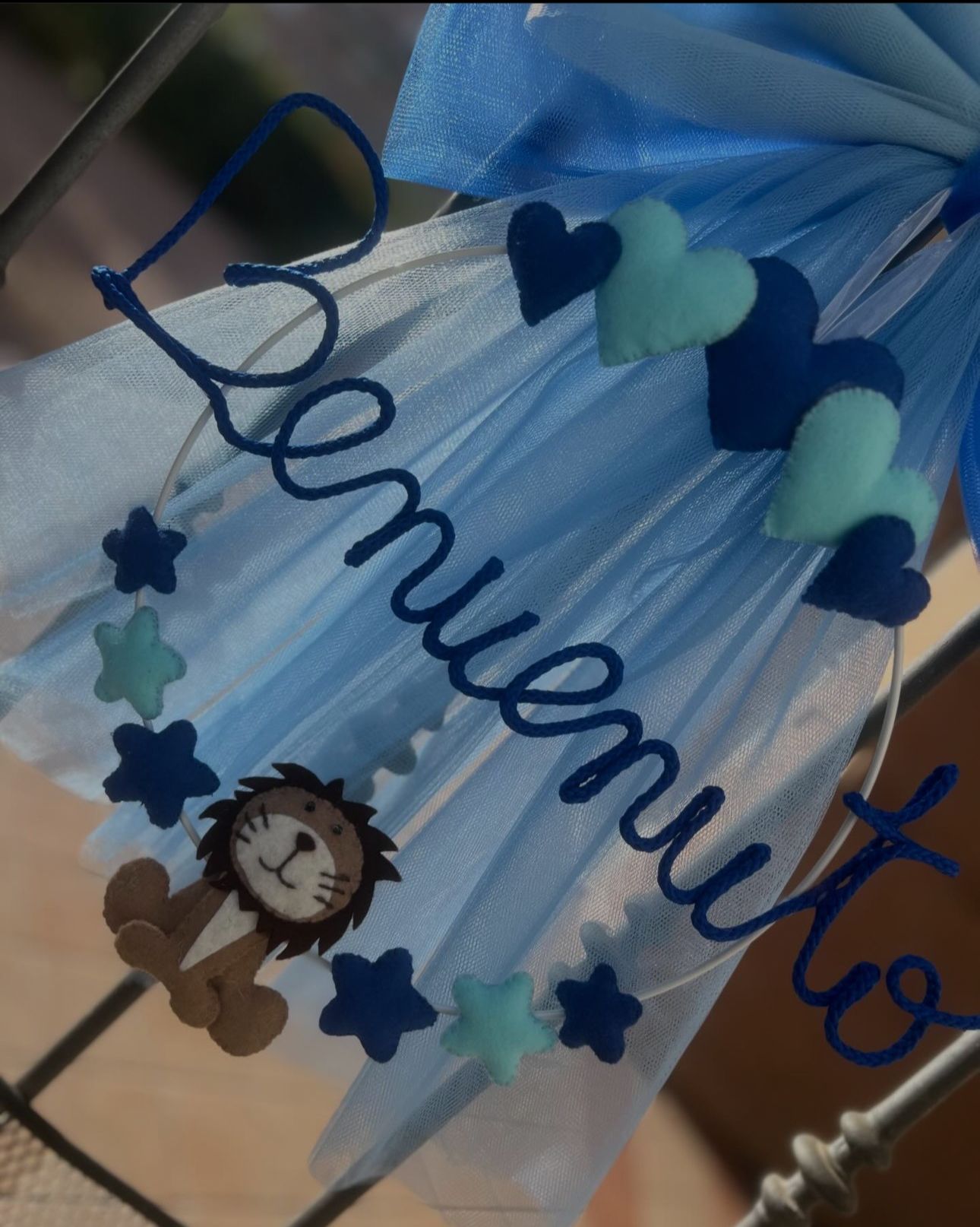 Il fiocco nascita L offre una dimensione più grande per annunciare la nascita del tuo bambino con eleganza. Realizzato a mano e personalizzabile, questo fiocco è perfetto per chi cerca un design più imponente. Puoi scegliere tra vari colori, personaggi come elefantino, orsetto e Minnie, e decorazioni in pannolenci. Il nome del tuo bambino sarà scritto in tricotin al centro del fiocco, montato su un cerchio di metallo bianco decorato con cuori, stelle o palloncini.