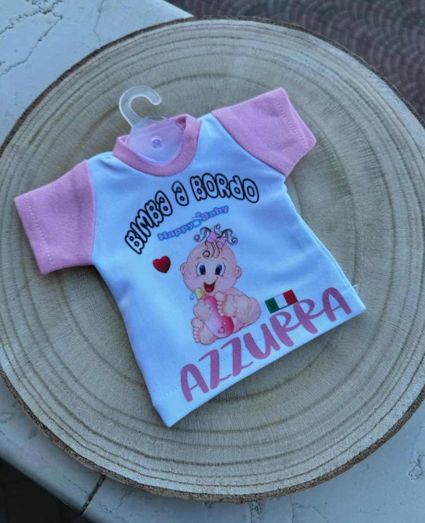 Una magliettina auto personalizzabile con il nome del tuo bambino, ideale per decorare il retrovisore dell’auto. Realizzata a mano, ogni magliettina è un pezzo unico, con il nome applicato in vinile termico. Perfetta per un tocco personale alla tua auto.
