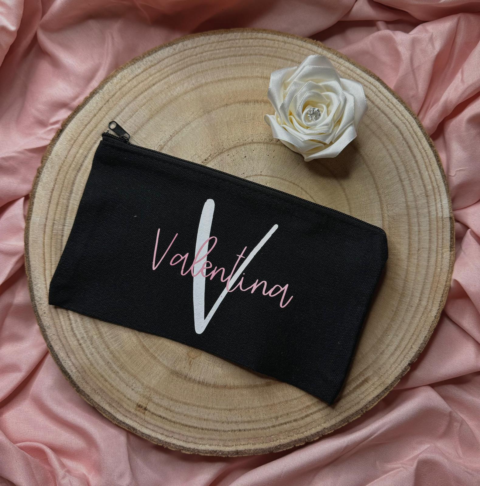 Pochette in tessuto nero, personalizzabile sia all’interno che all’esterno con un nome o una frase. Perfetta per essere utilizzata come astuccio o accessorio da borsa, aggiungendo un tocco personale al tuo stile.